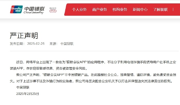 2月25日,中国银联发布声明称,近日,网络平台上出现了一款名为“银联会议APP”的应用程序,不法分子利用电信诈骗手段诱导用户在手机上安装该APP,存在窃取敏感信息、资金被盗等安全风险。中国银联严正声明,“银联会议APP”非中国银联产品。在此提醒社会公众,提高警惕,谨防诈骗,避免遭受资金损失。对于上述涉嫌不法及诈骗行为的实施者,公司将坚决配合公安机关予以打击并保留追究其法律责任的权利。