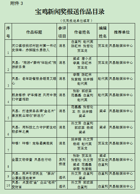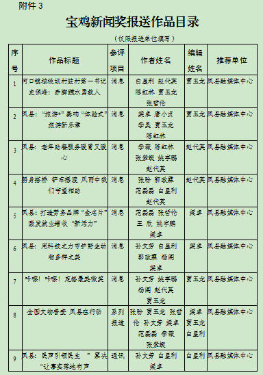 根据宝鸡市新闻工作者协会《关于开展2023年度宝鸡新闻奖评选的通知》要求,经凤县融媒体中心推荐作品,拟向宝鸡新闻工作者协会上报15件作品参评,现将宝鸡新闻奖报送作品目录予以公示。公示日期为2025年10月14日至2025年10月21日,在此期间,对公示内容有异议可拨打电话0917—4763500。